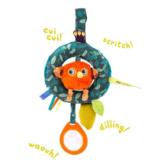 - Il regorge d’accessoires et de gris-gris pour amuser bébé : un prisme qui brille, des feuilles colorées, de jolis rubans, un bruit de hochet…