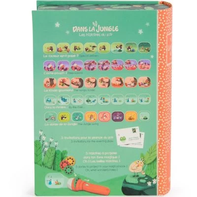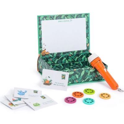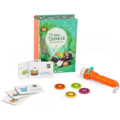 Le coffret lampe à histoires Dans la Jungle de la marque Moulin Roty est conçu comme un livre. Ce ravissant coffret tropical contient une lampe à projeter avec des disques à histoires et de précieux cartons d’invitation aux spectacles, en forme de mini enveloppes avec des messages secrets.