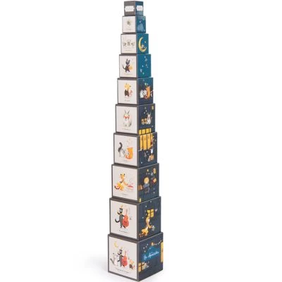 Les cubes empilables Les Moustaches 10 cubes de la marque Moulin Roty développent la capacité de l’enfant à manipuler et à compter.