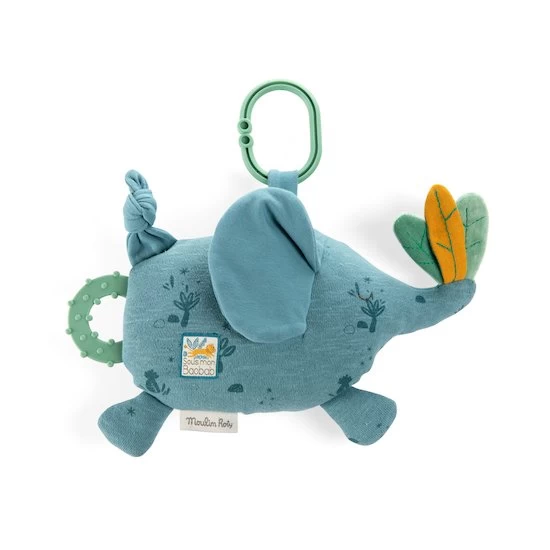 Elephant à suspendre aux couleurs de la savane qui propose différentes activités avec dans son ventre une clochette qui fait glong, un miroir bien caché, des petites feuilles sur le bout de la trompe qui font scritch et un jouet de dentition.