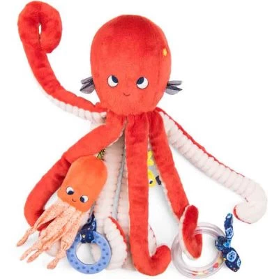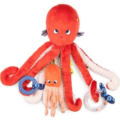 – Nombreuses activités : grelot, anneau à billes colorées, étiquettes et nouette à saisir, anneau de dentition et même un petit compagnon hochet, niché au creux de ses bras.