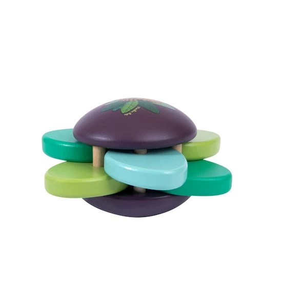 Ce hochet en bois de chez Moulin Roty en forme de nénuphar comporte de jolies feuilles dans les tons verts qui cachent un grelot au centre.