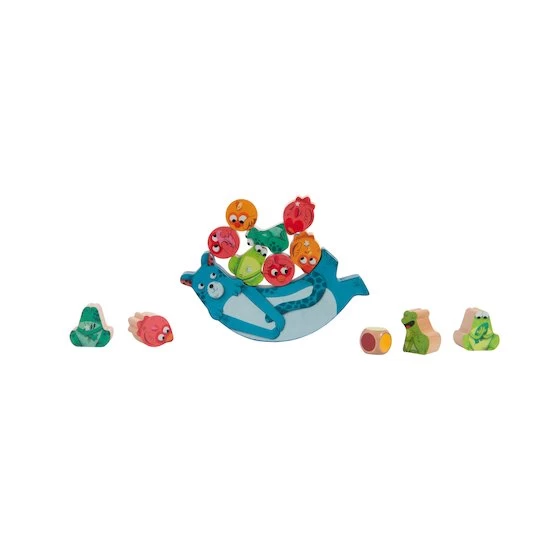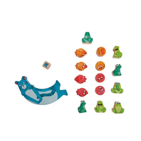 Lance le dé qui affiche la couleur à placer en équilibre sur Zimba la panthère. Fais attention de ne pas tout faire tomber !