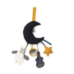 De nombreux accessoires suspendus pour éveiller bébé : un hibou tout doux avec du papier crissant dans les ailes, un miroir, une contrebasse hochet, une étoile pouët-pouët et un grelot.