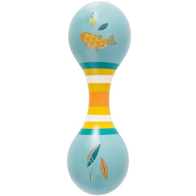 La maracas bleue Le voyage d’Olga de la marque Moulin Roty est en bois peint bleu ciel, aux illustrations folks et poétiques autour du thème du voyage, représentant petits poissons, plumes et grigris. Ce jeu développe le rythme et l’éveil musical des tout-petits.