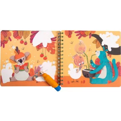 – Grâce au pinceau à eau, peindre les zones blanches sur chaque page pour faire apparaître les illustrations exotiques.
