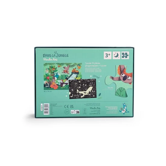 Rendez-vous à la cascade avec ce puzzle phosphorescent de 24 pièces issu de la collection Dans la Jungle ! Après l’avoir reconstitué, éteins la lumière afin que la magie opère. Contient 1 poster modèle pour aider l’enfant à le recomposer facilement.