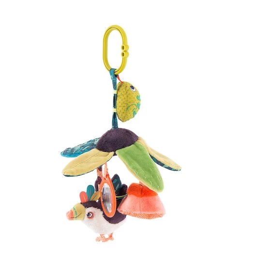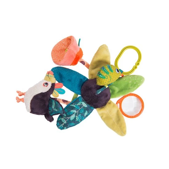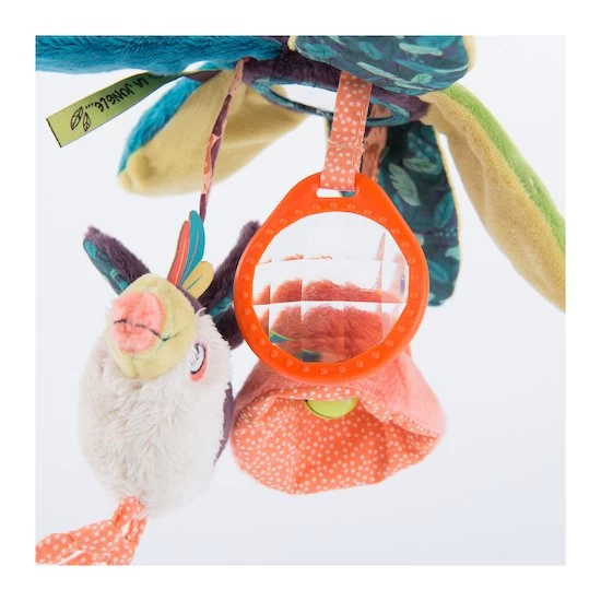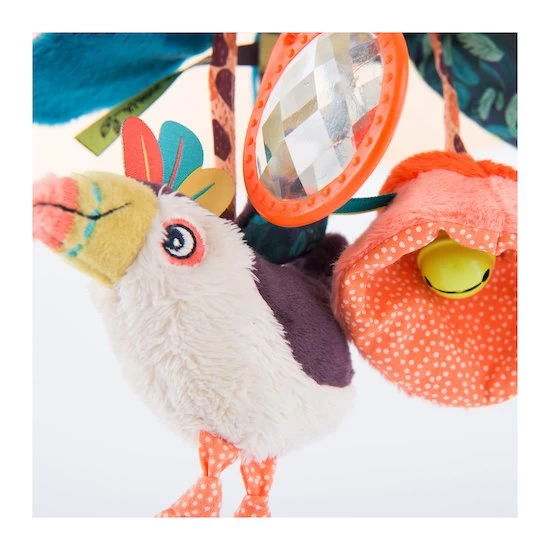 Cette suspension feuilles d’activités reprend les tons et motifs de la collection Dans la jungle de chez Moulin Roty. À suspendre à la poussette, au cosy ou au parc, elle offre de nombreux accessoires pour divertir les tout-petits : des feuilles contenant du papier crissant, un prisme, un petit toucan hochet, un caméléon-pouët et une fleur contenant un grelot.